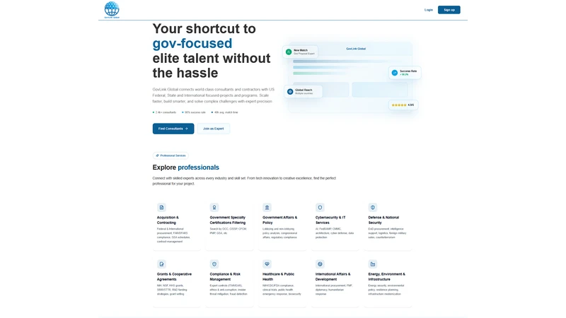 MERN platform connecting elite consultants with US & global government projects. Smart search & matching; 2.4k+ talent, 98% success, ~48h avg match. Built for scale with clean, user-focused UI/UX.